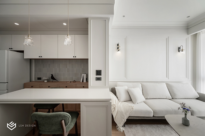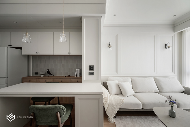 화이트 웨인스코팅 벽면이 클래식한 품격을 선사하는데요,