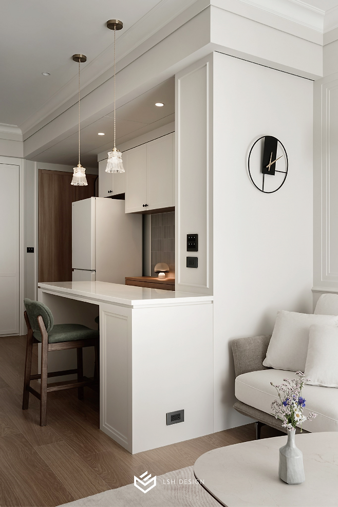 이 홈바 역시 웨인스코팅으로 통일감을 주어 주방과 거실 사이의 흐름이 끊기지 않도록 했어요.