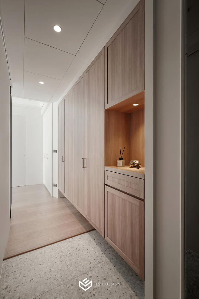 현관은 길고 좁은 구조를 효율적으로 활용한 설계가 눈에 띕니다.