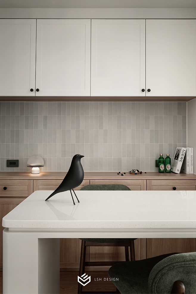 홈바 뒤편에는 홈카페 수납장이 자리하는데요, 그레이 세로 타일이 화이트 상부장과 우드 하부장을 차분하게 연결해줍니다.