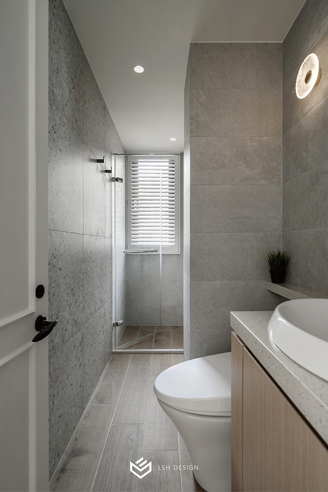 무광 그레이 테라조 타일로 마감한 벽면은 모던하면서도 따뜻한 느낌을 주며, 세면대 위 간접조명은 하루의 피로를 풀어주는 힐링의 시간을 선사할 것 같아요.