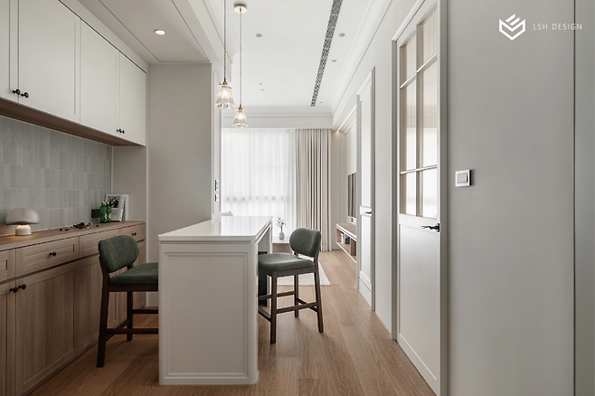 이 홈바 역시 웨인스코팅으로 통일감을 주어 주방과 거실 사이의 흐름이 끊기지 않도록 했어요.