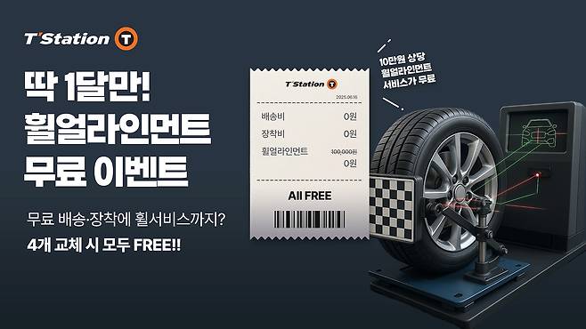 티스테이션닷컴을 통해 행사 제품 4개 일괄 구매 시 알림톡 또는 문자 메시지로 휠 얼라인먼트 서비스 안내 문자가 발송된다. 이후 고객이 지정한 일정에 맞춰 티스테이션 매장 방문 시 타이어 무료 배송∙장착은 물론 최고급 장비를 활용한 휠 얼라인먼트 서비스 혜택까지 모두 누릴 수 있다.