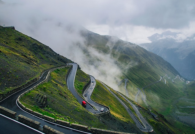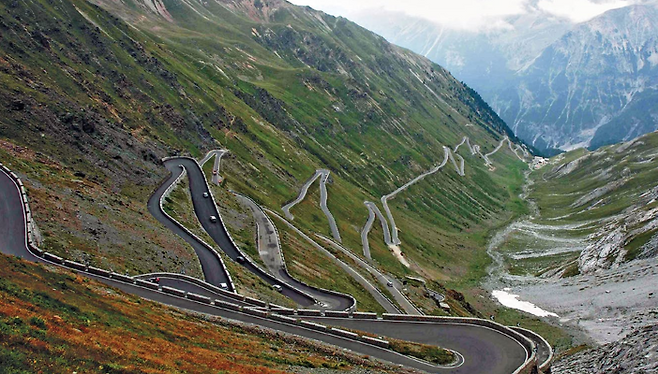 스텔비오 패스는 180도가 넘는 급커브가 무려 48개나 되는 까닭에 위험천만한 도로로 꼽히며 안개가 끼는날에는 절대 운전을 할수없지만 아이러니하게 도로와 주변경치가 주는 아름다움 때문에 죽기 전에 꼭 달려봐야 할 도로에도 이름을 올리고 있습니다.