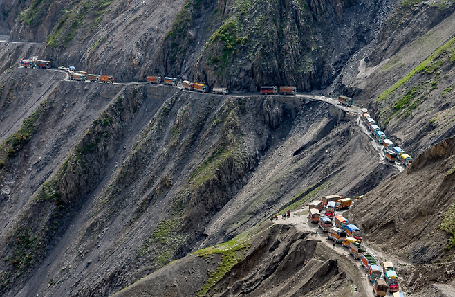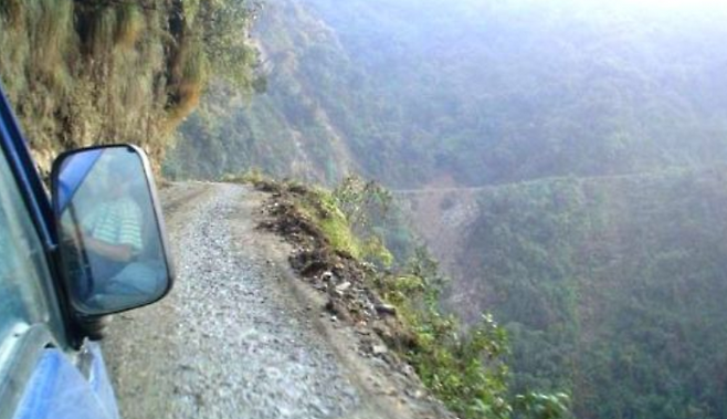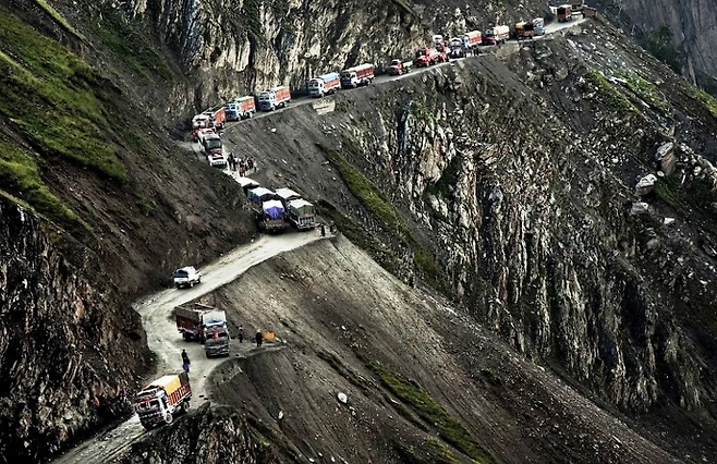 ▽이 도로는 Zoji라는 인도의 높은산을 통과하는 도로로 인도 샤리와 이쉬타리를 잇는 길인데, 우기에는 커브 길을 돌다 떨어지는 차가 허다하며 군데군데 추락한 차들의 표시가 남아있어 세계에서 가장 위험한 도로 중 한곳으로 꼽힙니다.
