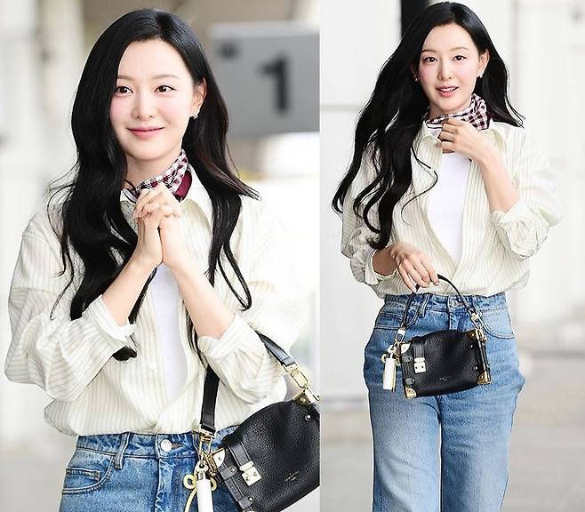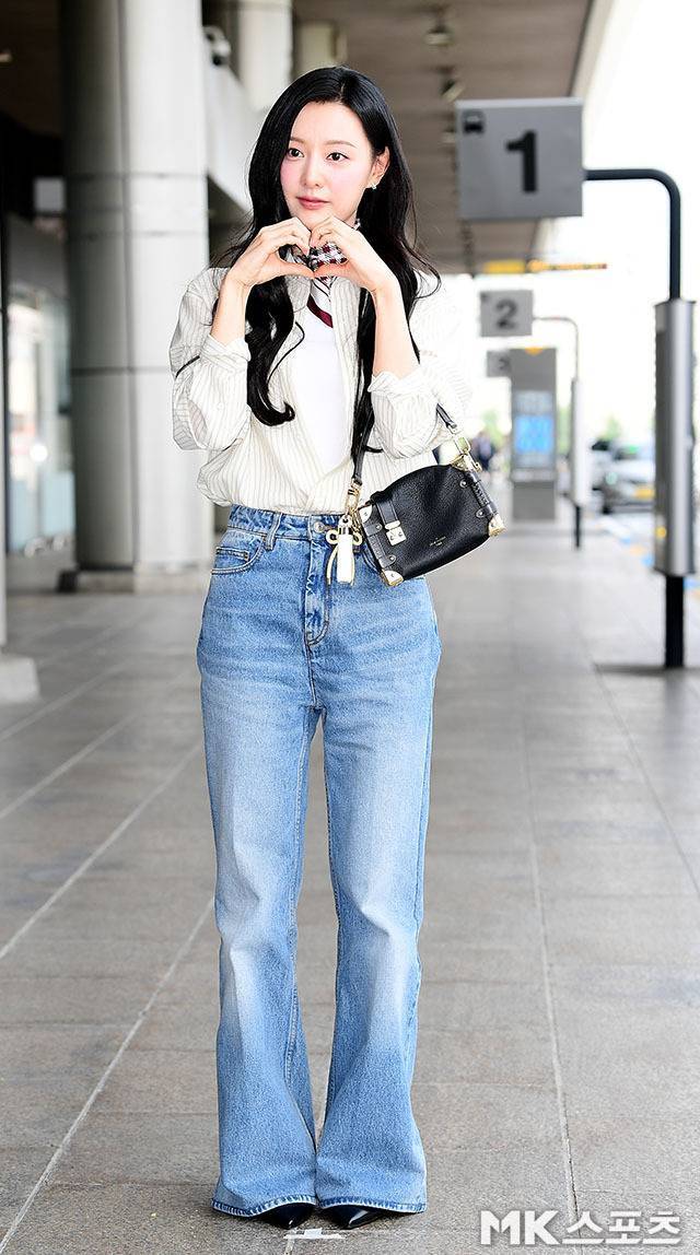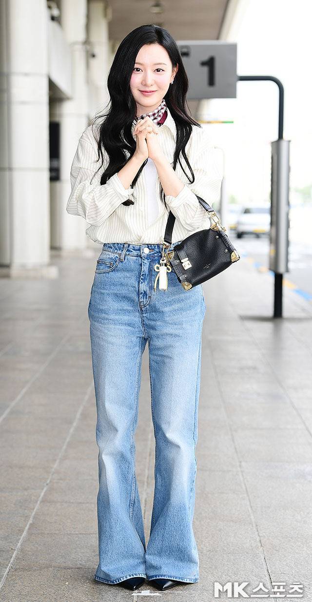김지원은 스트라이프 포인트가 들어간 루즈핏 셔츠에 기본 화이트 이너를 레이어드하고, 내추럴한 라이트 워싱의 플레어 진을 매치해 편안하면서도 단정한 공항룩을 완성했습니다.