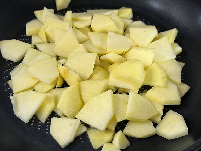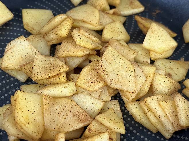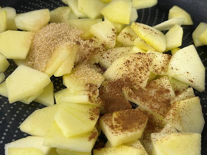 사과 1개 기준 얇게 썰어서 설탕 10g과 시나몬 가루 3g을 넣고 팬에서 수분을 날리며 졸입니다. 중약불에서 천천히 졸이면 자연스러운 단맛과 시나몬의 향이 어우러져 사과 맛이 훨씬 고급스러워집니다.