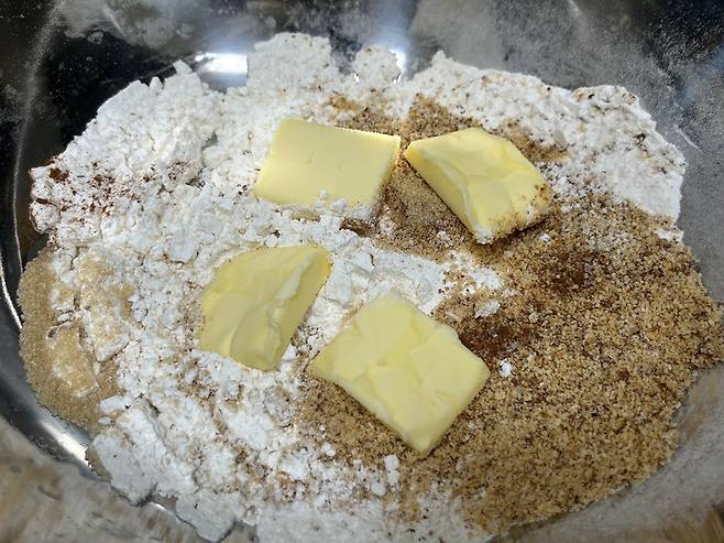 파이 반죽을 만들어 사과 파이를 만들어도 맛이 좋습니다. 파이 반죽은 박력분 75g, 아몬드가루 25g, 버터 50g, 베이킹파우더 2꼬집, 설탕 30g을 섞어 만듭니다. 가루류는 체에 쳐서 곱게 내려 주세요. 버터는 스크래퍼로 최대한 잘게 쪼개서 크럼블 형태가 되도록 반죽합니다.