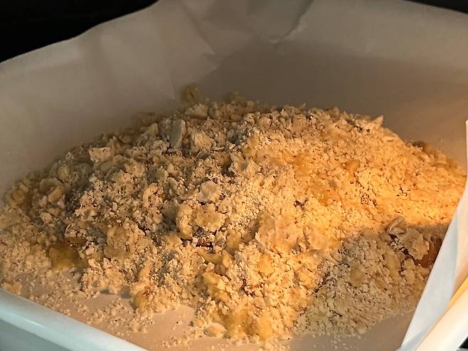 이제 반죽 60% 정도를 아래에 깔고 위에 사과조림을 얹고 다시 반죽을 덮어서 오븐에 구워 보세요. 오븐은 190도 30분으로 설정했습니다.