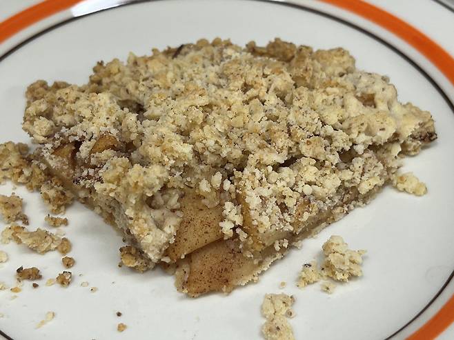 아몬드가루 들어간 반죽의 고소함과 달콤한 사과가 잘 어울리는 애플파이가 완성되었습니다. 아무리 맛없는 사과도 이렇게 만들어 두면 맛있게 즐길 수 있습니다.