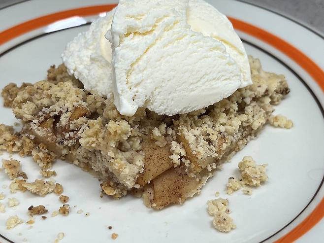 여기 위에 바닐라 아이스크림 1스푼 곁들여서 드셔 보세요. 정말 맛있는 사과 디저트가 됩니다.