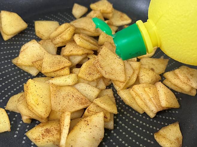 여기에 레몬즙을 1스푼 추가해 보세요. 레몬즙은 산미를 더해 사과에 상큼한 맛을 더해줍니다. 레몬즙은 많이 넣으면 신맛이 날 수도 있기 때문에 1스푼 정도만 넣습니다.
