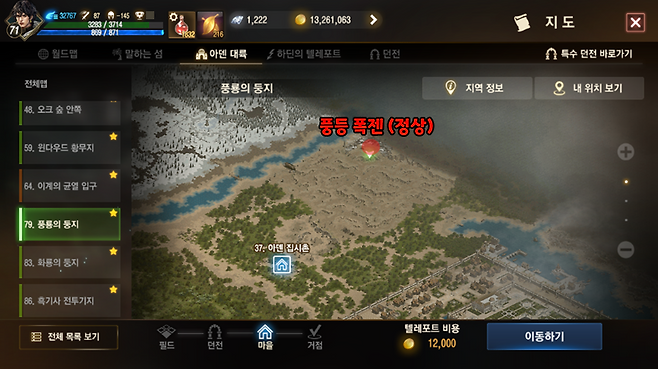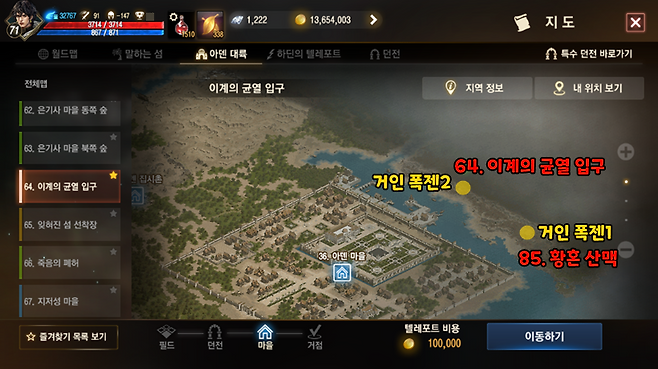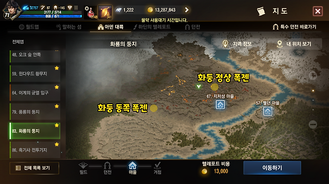 본토 3종 - 풍룡의 둥지, 화룡의 둥지, 설벽 설벽 - 풍등 - 화둥 순으로 난도가 높습니다. 설벽은 AC만 높으면 되지만, 풍등은 마법 피해 때문에 MR도 챙겨야 하며, 화둥은불타는 궁수의 스트라이크 게일(ER 감소) 때문에 리덕션이 중요합니다. 화둥 동쪽 폭젠은 아데나 자리, 아데나 폭젠이라 불리는데, 폭젠 내 왼쪽 끝 구석 자리에 '기억'해두고 이반으로 이동할 수 있습니다. 화동 정상 폭젠 바로 왼쪽과 위쪽은 피닉스라 리스폰되며, 정상 다이아 텔자리는 이프리트가 리스폰됩니다. 그러므로 83. 화룡의 둥지로 이동하여 우측 끝으로 올라가야 안전합니다.