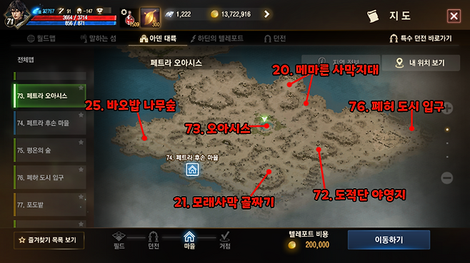 페트라 사막 작년 7주년 에피소드에 등장한 진짜 신맵입니다. 폭젠 전부 아데나 텔레포트로 이동할 수 있어 접근성이 매우 쉬우나, 본토에서 최고 난도를 자랑합니다. 바오밥 나무숲 - 모래사막 골짜기 - 메마른 사막지대 - 도적단 야영지 - 폐허 도시 입구 순으로 난도가 높고, 모든 사냥터에서 캐릭터 레벨과 MR의 합계가 370 이상이어야 포이즌, 커스, 블라인드에 걸리지 않습니다. 최소 80레벨 이후 바오밥 나무숲부터 노려볼 수 있을 듯하네요.