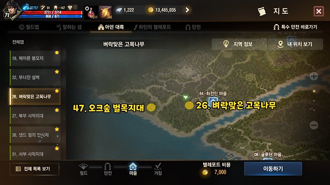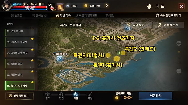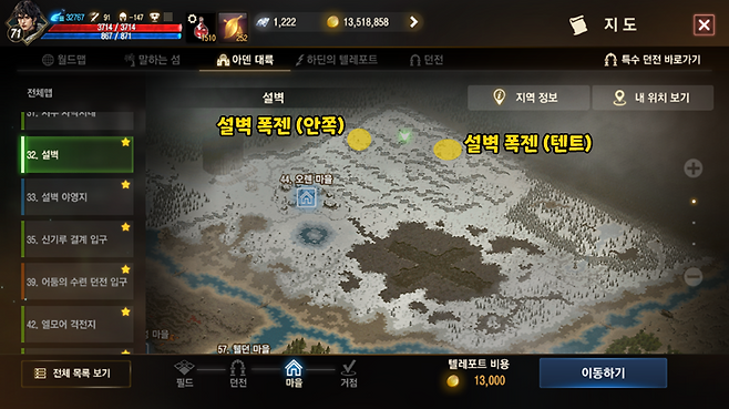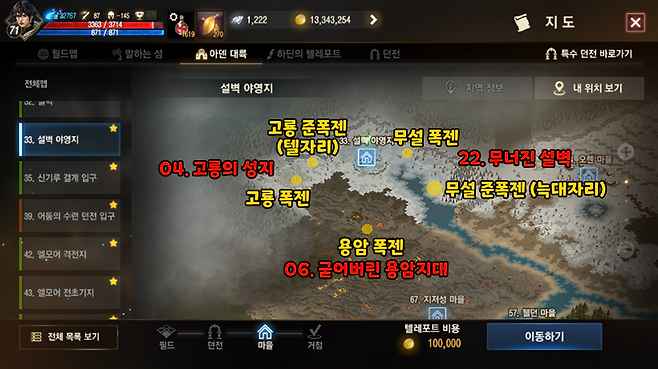 본토 3종 - 풍룡의 둥지, 화룡의 둥지, 설벽 설벽 - 풍등 - 화둥 순으로 난도가 높습니다. 설벽은 AC만 높으면 되지만, 풍등은 마법 피해 때문에 MR도 챙겨야 하며, 화둥은불타는 궁수의 스트라이크 게일(ER 감소) 때문에 리덕션이 중요합니다. 화둥 동쪽 폭젠은 아데나 자리, 아데나 폭젠이라 불리는데, 폭젠 내 왼쪽 끝 구석 자리에 '기억'해두고 이반으로 이동할 수 있습니다. 화동 정상 폭젠 바로 왼쪽과 위쪽은 피닉스라 리스폰되며, 정상 다이아 텔자리는 이프리트가 리스폰됩니다. 그러므로 83. 화룡의 둥지로 이동하여 우측 끝으로 올라가야 안전합니다.