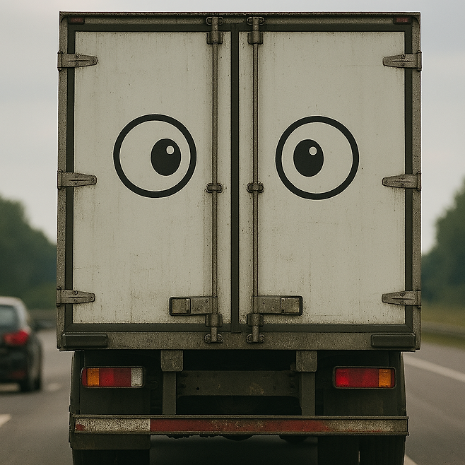 고속도로나 국도를 달리다 보면, 거대한 화물차의 뒷문에 붙어있는 귀여운 '눈알' 스티커를 보고 깜짝 놀랄 때가 있습니다.