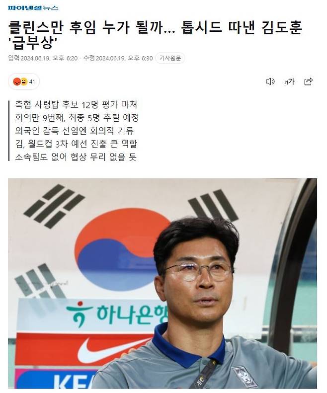 대한축구협회는 9번의 회의에도 불구하고 최종 후보조차 결정하지 못한 상황입니다. 이미 약속한 5월을 훨씬 넘겼고, 임시 감독으로 북중미 월드컵 2차 예선을 마쳤음에도 외국인 감독의 윤곽은 여전히 오리무중입니다. 한국이 노렸던 감독들은 이미 다른 나라와 계약을 맺고 있어, 9월 초에 시작되는 최종 예선을 앞두고 시간이 매우 부족합니다.
