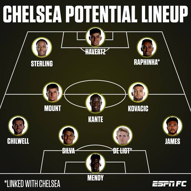 미국 ESPN은 7일(한국시간) 다음 시즌 첼시의 예상 라인업을 공개했다. 4-3-3 포메이션으로 이뤄진 이 라인업에는 스털링을 포함해 하피냐, 데 리흐트 등 이적설이 돌고 있는 선수들이 포함됐다.
