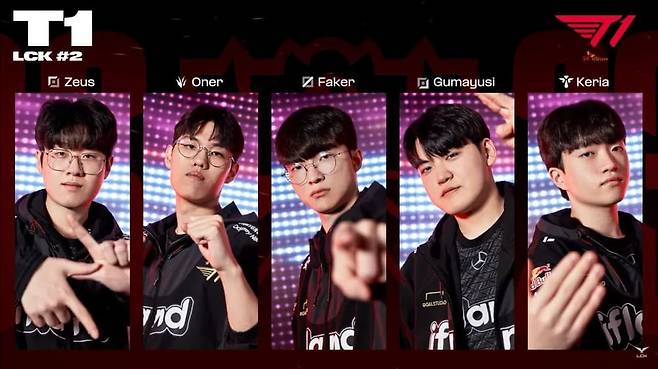 T1 선수 : 탑 제우스(최우제), 정글 오너(문현준), 미드 페이커(이상혁), 원딜 구마유시(이민형), 서포터 케리아(류민석)