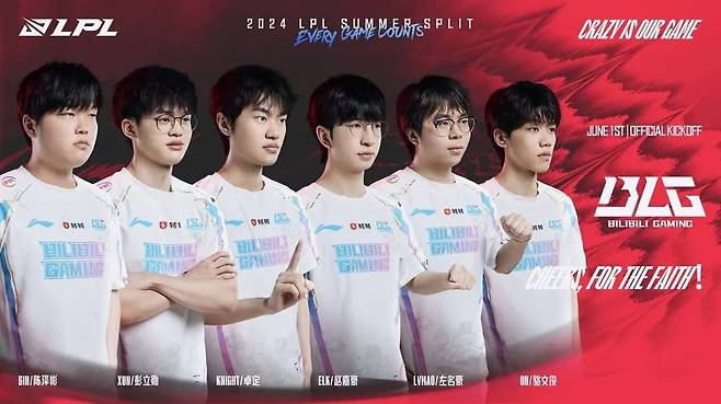 빌리빌리 선수 : 탑 빈(천쩌빈), 정글 쉰(펑리쉰), 미드 나이트(줘딩), 원딜 엘크(자오자하오), 서포터 온(려원쥔)