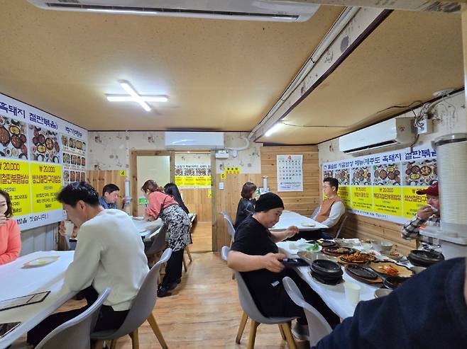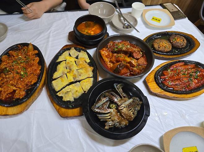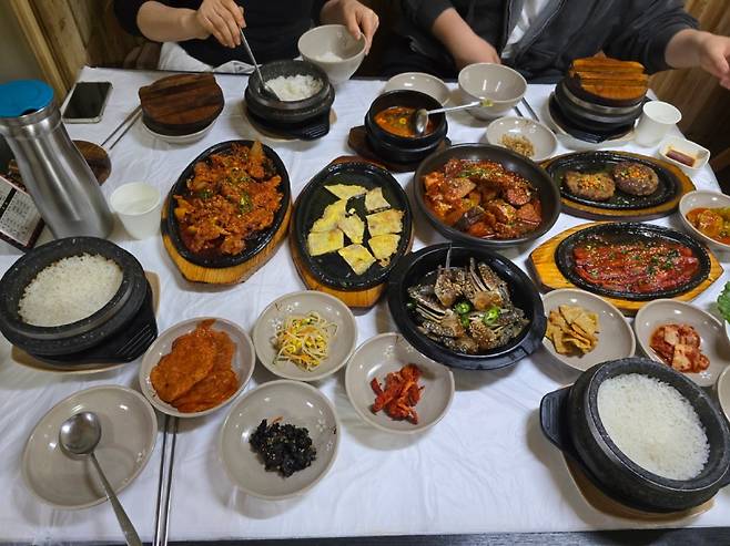 그리고 얼마나 더 기다렸을까? 드디어 호출되어 식당 안으로 들어갈 수 있었다. 5가지 밥상 중에서 우린 갈치시골밥상 2인분과 게장시골밥상 2인분을 주문했다. 갈치조림을 제외하고 간장게장, 흑돼지철판볶음, 떡갈비, 육전, 더덕구이, 된장찌개가 함께 포함되어 있어 4인분으로 나와야 하는데 상차림을 보니 조금씩 빠진 듯했다. 예를 들어 된장찌개의 경우 2인 밥상에 하나씩이니 뚝배기 2개가 나와야 하는데 된장찌개가 하나만 나온다. 물어보니 이렇게 나오는 게 맞단다. 간장게장 역시 처음엔 4쪽만 나왔길래 4인분 맞냐고 하니 착각했다며 추가해서 다시 갖다준다. 이런 건 명확해야 한다.