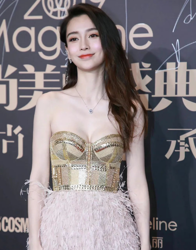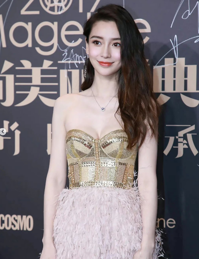 최근 공식석상에서 안젤라 베이비는 골드컬러 에 깃털 형태의 치마가 화려한 드레스를 입고 등장했습니다.