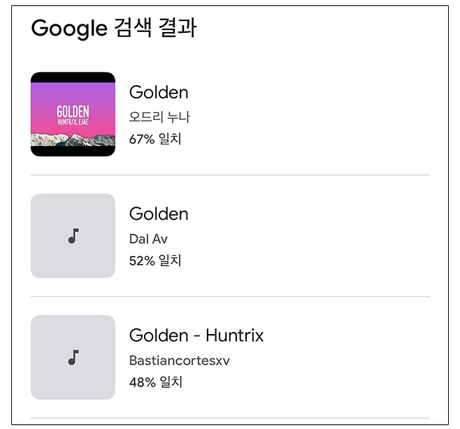 정식 음원을 스피커로 들려주는 방식이 아니라 허밍으로 노래를 찾기 때문에 검색 결과에 일치하는 정도가 표시된다. 직접 시도해 봤을 때도 몇 번 시도 끝에 '골든'이 검색 되었는데 아무래도 기획자의 허밍 실력이 문제인 듯하다.