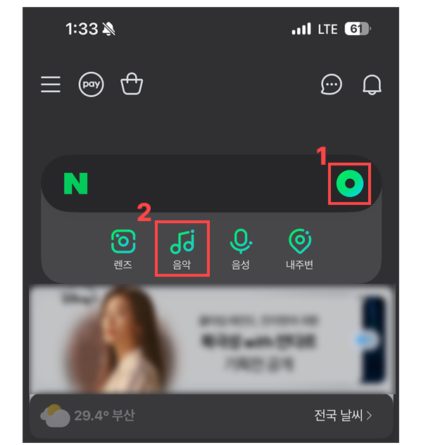 네이버 앱에서 노래 찾기 기능을 사용하기 위해서는 메인 화면에 위치한 '초록색 원' 버튼을 가볍게 눌러보자. 그럼 렌즈, 음악, 음성, 내주변까지 네 가지 기능이 나오게 되는데 이중에서 음악 기능이 우리가 찾는 노래 찾기 기능이다.