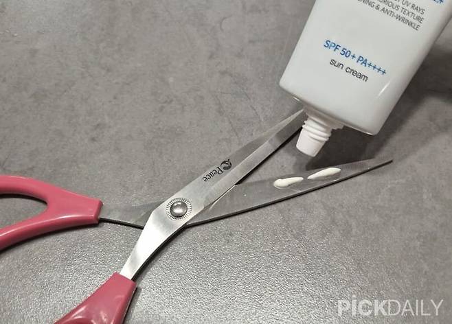스티커나 테이프를 자르고 나면 가위날에 끈적한 접착제가 남는다. 이런 끈적임도 선크림 하나면 쉽게 해결된다. 가위날에 선크림을 바른 후 1~2분 정도 기다렸다가 마른 천으로 닦아내면, 선크림의 유분이 접착 성분을 녹여 깔끔해진다. 찐득한 가위가 쌓여 있다면 꼭 한 번 시도해보자.