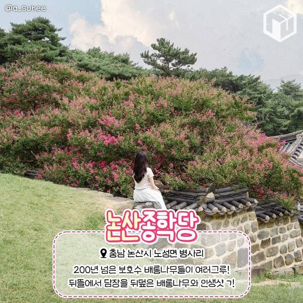 백일 간의 화려한 여름 풍경을 놓치기 아쉽거나 일 년의 기다림이 길게 느껴지지 않나요? 그렇다면 이번 주말은 고즈넉하고 여유로운 배롱나무 명소에서 여름 한정, 특별한 자연을 만끽해보세요 :)