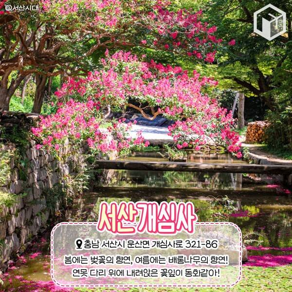 봄에는 겹벚꽃과 벚꽃이 아름다운 서산 개심사. 매년 여름이 되면 평화로운 사찰을 붉은빛의 백일홍이 뒤덮습니다. 다른 곳의 배롱나무꽃보다 짙은 붉은 색을 띄고 있는 것으로 잘 알려져있는 배롱나무 명소이기도 한데요. 특히 대웅전 앞 연못 주위가 배롱나무 포토존으로 유명합니다.