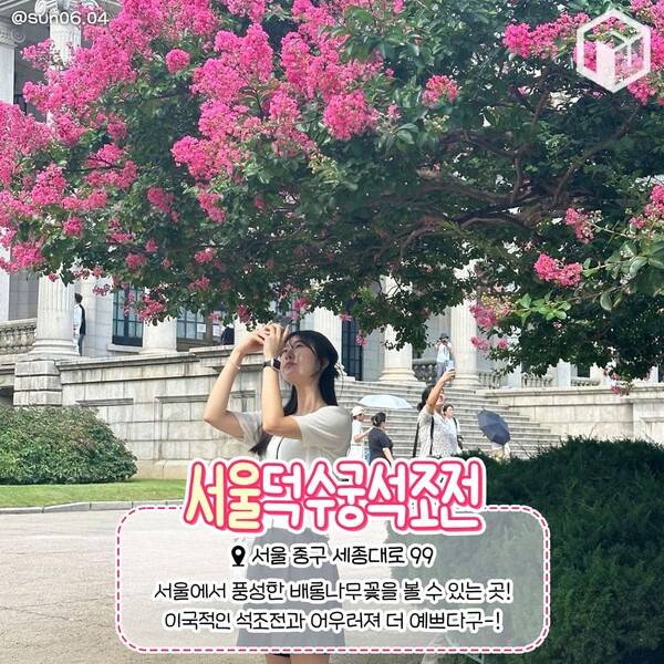 서울에서 가장 풍성한 배롱나무를 볼 수 있는 대표적인 배롱나무꽃 명소 덕수궁 석조전입니다. 근대화를 상징하는 이국적인 건축물 석조전 앞, 양 옆으로 커다란 배롱나무에서 화려하게 진분홍빛의 백일홍이 피어나는데요. 3그루이지만 풍성하게 피어난 배롱나무꽃은 석조전과 어우러져 깊이있는 분위기를 자아냅니다.