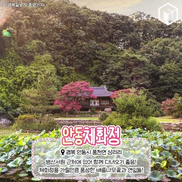 안동의 대표적인 배롱나무꽃 명소 병산서원 인근에 위치한 체화정입니다. 체화정은 조선시대에 건축된 정자로, 정자 앞 세개의 섬이 있는 인공 연못과 주변 풍경이 아름다운 여행지로 손꼽히는데요. 여름에는 연못가득 연잎이 뒤덮어 더욱 싱그러운 여름의 풍경을 볼 수 있습니다.