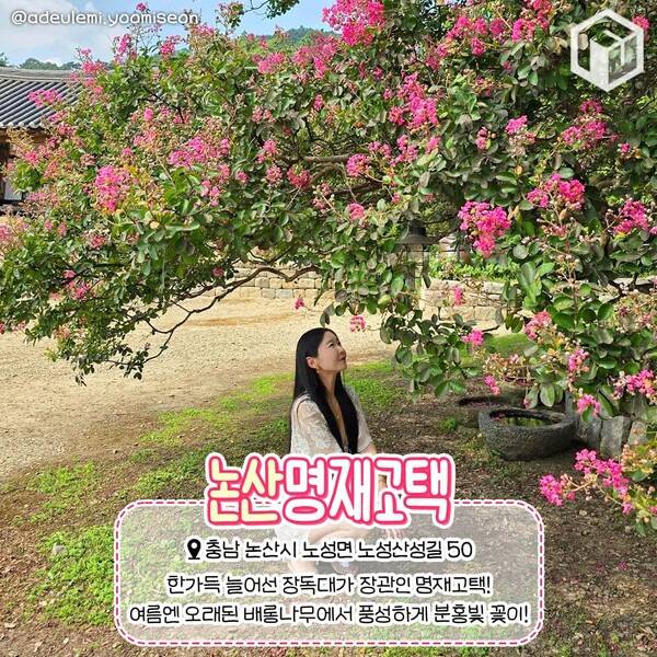 매년 여름 논산은 배롱나무 명소가 가득해 수많은 여행객들이 찾는 여행지가 됩니다. 특히 명재고택 앞 커다란 배롱나무는 수많은 사진작가들의 작품이 되어주고 있는데요. 배롱나무 뒤로 얼핏 보이는 명재고택의 고즈넉한 자태는 한국적인 여름 풍경을 온전히 완성합니다.