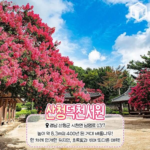 조용하고 평화로운 산청의 덕천서원은 매년 여름 짙은 분홍빛의 배롱나무가 마당을 가득 채워 고즈넉한 풍경이 펼쳐지는 배롱나무 명소입니다. 산청 덕천서원의 입구부터 출입문과 담장을 넘길 정도로 풍성한 백일홍이 감탄을 절로 자아내는데요.