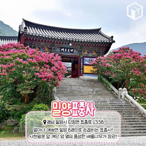 표충사는 임진왜란에서 승병으로 활약한 승려들을 모시는 호국 사찰입니다. 사찰을 둘러싼 천황산과 재약산의 산세에 밀양 8경으로 손꼽히는데요. 표충사 일주문과 수충루 너머 사천왕문 앞 계단 양쪽에서는 커다란 배롱나무가 매년 여름 풍성하고 화려하게 꽃을 피웁니다.