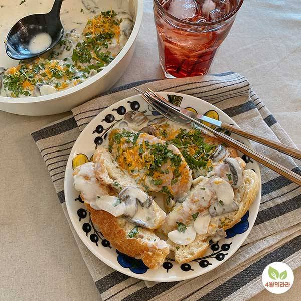 → 담아내기: 완성된 닭가슴살 구이를 그릇에 담고, 구운 치아바타와 함께 생크림 소스를 얹어내면 근사한 한 접시가 완성됩니다.