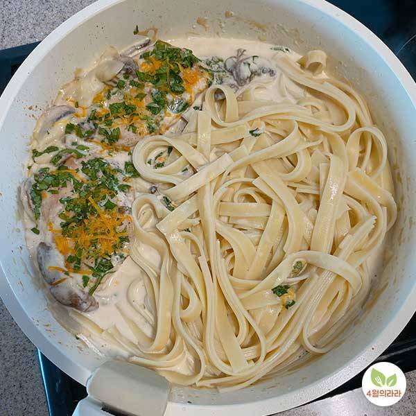 → 남은 생크림 소스에 삶은 페투치네 면을 넣고 골고루 섞어줍니다. 닭가슴살 2덩이를 먹기 좋은 크기로 잘라 함께 섞어주면 간단하면서도 맛있는 생크림 파스타가 완성됩니다.