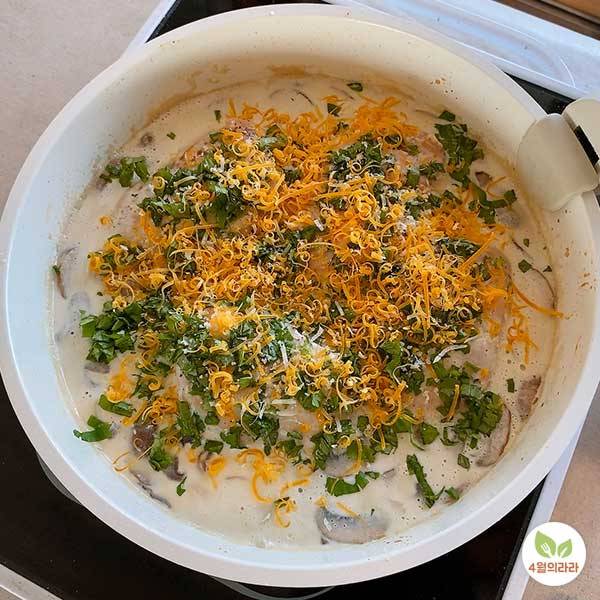 → 소스 끓이기: 화이트와인 1/2컵을 넣고 끓어오르면 약불로 줄인 뒤 생크림 1컵을 넣어 저어가며 끓여줍니다. 간은 기호에 맞게 조절해 주세요.