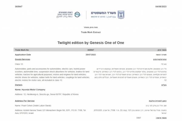 제네시스가 이스라엘에서 ‘트와일라잇 에디션 바이 제네시스 원 오브 원(Twillight edition by Genesis One of One)’에 대한 상표권을 출원했다. 커스터마이징 사업부에서 탄생한 첫 맞춤형 제품의 이름으로 보인다.