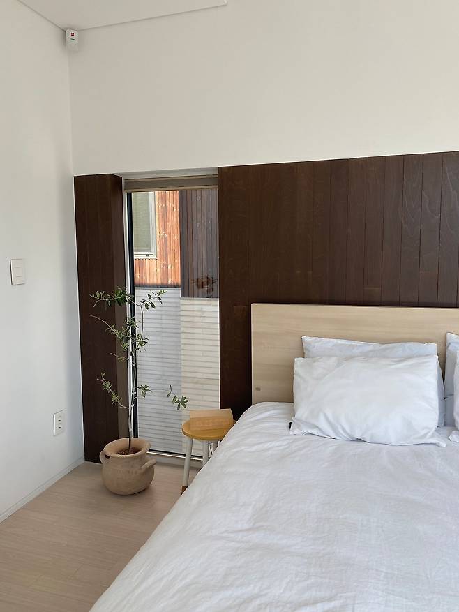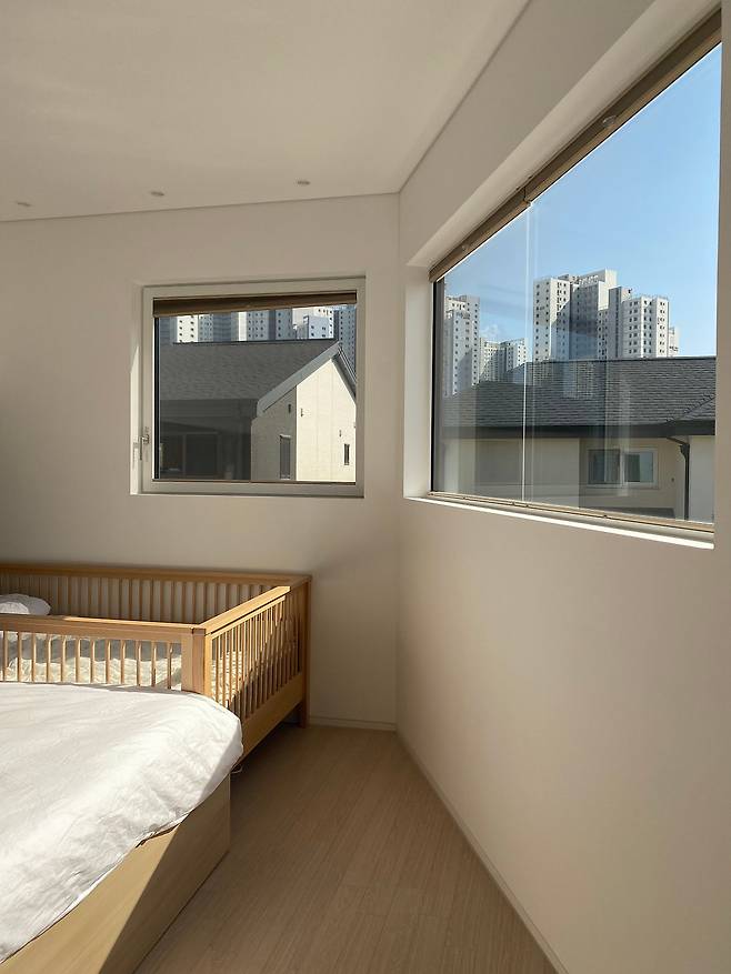 다음으로 보여드릴 공간은 침실입니다. 저희 집에는 반듯한 사각형의 방이 없어요. 심지어 5각형인 방, ㄴ자의 방도 있지요. 그중 침실은 한 면이 기울어진 사각형의 방입니다. 베이 윈도가 있으면 좋겠다고 생각했지만 면적이 안 나와서 베이 구조의 창만 만들었어요. 서쪽 창은 해 질 무렵 해가 평온하고 따뜻하게 들어옵니다. 침대가 자리하는 벽면에 직사각형의 긴 창도 만들었어요. 답답한 게 싫어서 창이 많은 방이 되었습니다.