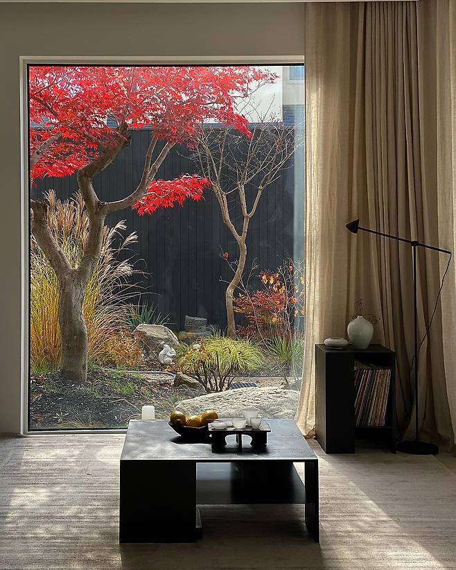 동양미 물씬 풍기는 목재로 제작한 간살문을 열면 정돈이 잘 된 정원의 청단풍 고목이 커다란 갤러리 창을 통해 보입니다.