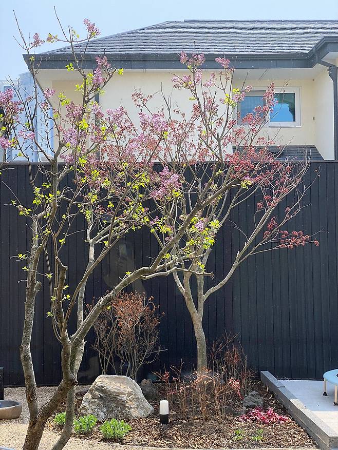 지금 그 자리에는 흙과 배수를 보강하여 청단풍 고목이 자리 잡고 있습니다. 한 해를 무사히 넘겼지만 몇 년은 안심할 수 없는 것 같아요. 나무들이 튼튼히 자리 잡기까지 한 해만 더 잘 버텨 주면 될 것 같아요. 청단풍이 가을에 빨갛게 물이 들면 동양풍의 느낌이 폭발합니다. 이 모습도 좋아요. 2023년에는 단풍 시기에 급격하게 추워졌었어서 예쁘게 물들지 못했습니다. 계절이 변화하는 것을 주택살이를 하고 나서 알게 되었어요. 주택살이가 주는 묘미입니다.