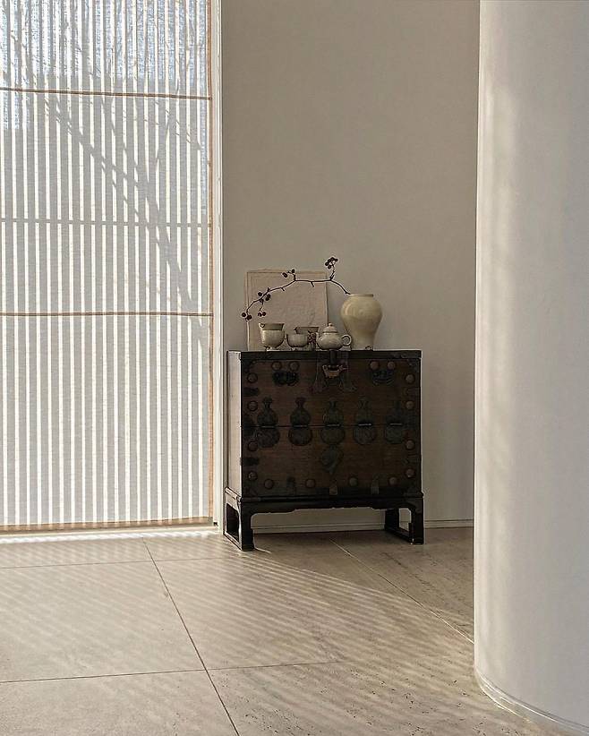 시댁에서 구석에 존재감 없이 어머님께서 시집올 때 산 40년이 넘은 반닫이 장이 있는데 우리 집에 잘 어울릴 것 같아서 가져와서 알맞은 공간에 두니 제 생각이 맞았어요. 찰떡같이 너무 잘 어울리는 거죠. 제 보물 중 하나입니다.