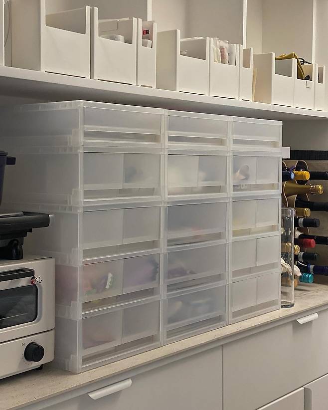 종류별로 용이하게 정리할 수 있도록 싱크대 하부장, 맞춤 상부 선반, 모듈 서랍장들을 활용하여 이름표를 붙이고 분류하여 정리하였어요. 아이의 머리핀이나 문구용품 등 아주 작은 물건들을 종류별로 정리하기 위해 무인양품에서 모듈 서랍장을 구입해서 서랍마다 같은 부류의 그룹을 만들어 정리하고 있습니다.