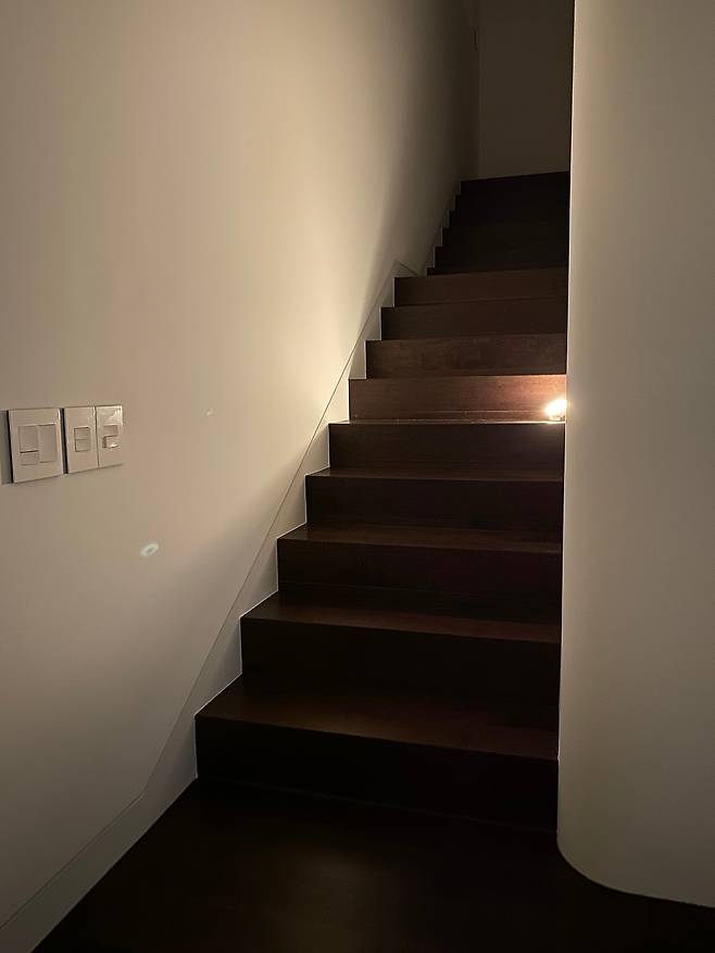 2층의 색감은 1층과 통일되도록 짙은 우드 톤으로 맞춰주었습니다. 한 가지 다른게 있다면 2층에서는 타일이 아니라 강마루를 사용했다는 건데요. 덕분에 마음 편하게 사용할 수 있는 공간이 되었습니다.