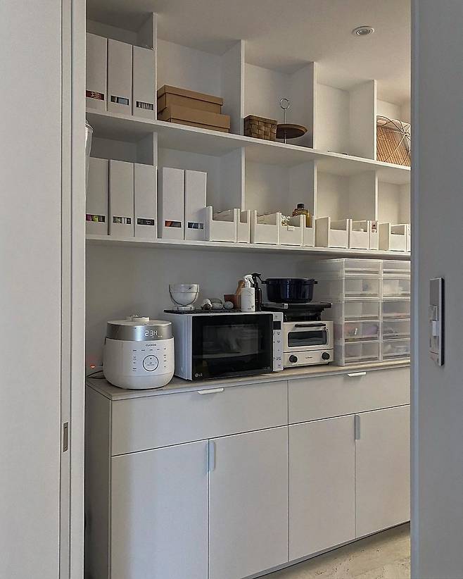 베란다는 팬트리 겸용으로 활용하는 공간입니다. 다양한 물건을 수납해야 하므로 가장 심플하게 공간을 만들었어요. 각종 잡동사니를 가장 효율적으로 정리할 수 있는 꼭 필요하고 아주 자주 쓰는 공간입니다. 저장 음식을 두는 공간, 그릇을 보관하는 공간, 각종 툴이나 약을 보관하는 공간, 청소 도구를 보관하는 공간으로 세세히 나누어져 있습니다.
