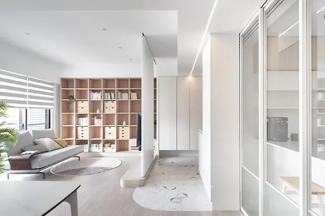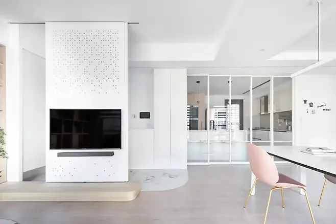 맑고 투명한 스크린, 슬라이딩 도어는 현실과 환상의 경계를 은은하게 허문다. 복잡함 없는 디자인이 집의 첫인상을 평온하게 만든다.