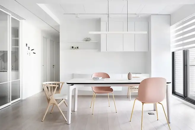 크고 차분한 식탁 위, 부드러운 핑크색 의자가 그 따뜻함을 가중시키며 업무와 식사가 모두 가능한 만능 공간이 된다. 깔끔하게 정돈된 수납장이 기능성과 미적 감각을 동시에 갖췄다.
