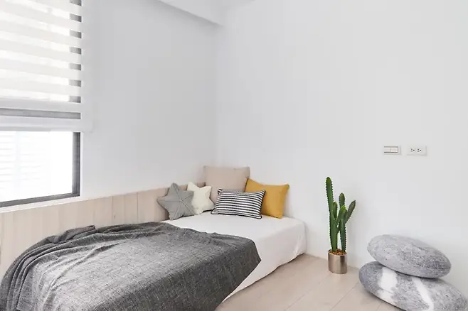 침대 위로 곡선형 천장이 부드럽게 감싸며, 흰색 톤이 심신을 차분하게 만들어준다. 숨겨진 수납공간과 독립된 드레스룸은 실용성과 프라이버시의 두 마리 토끼를 모두 잡았다.